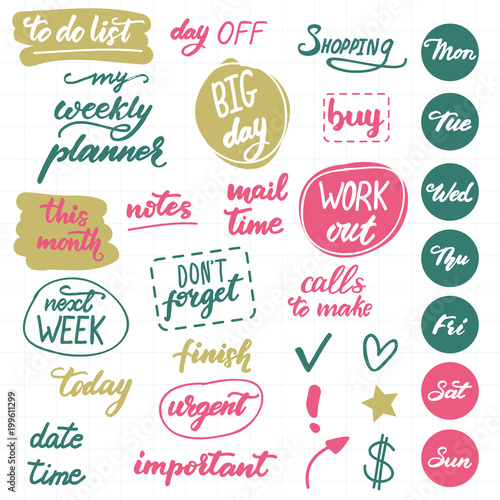 Set of lettering for daily planning and to do lists. Vector illustration.