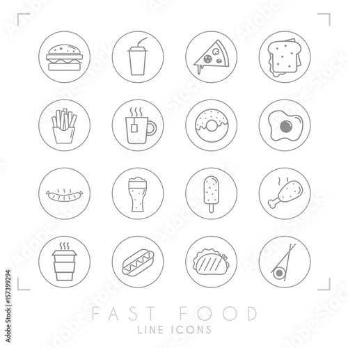 Set of line fast food icons in line circles. Flat style. Coffee, hamburger, pizza, sandwich, fried potato, tea, donut, egg, grilled sausage, beer, ice cream, chicken, hot dog, tacos, sushi roll