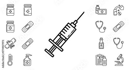 Set of medical icons in outline style, including a syringe, stethoscope, pills, bandages, thermometer, and microscope, perfect for healthcare and science-related designs, apps, and social media