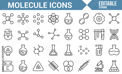Set of molecule icons representing chemical structures, atoms, flasks, and scientific research tools.