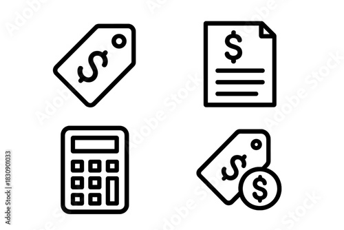 Set of outline icons representing pricing, financial documents, calculation, and commerce