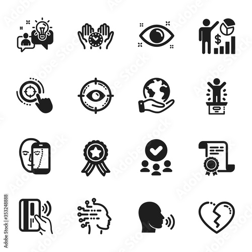 Set of People icons, such as Safe time, Health eye. Certificate, approved group, save planet. Idea, Human sing, Winner podium. Broken heart, Face biometrics, Eye target. Vector