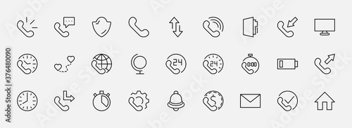 Set of Phone vector line icons. It contains the symbols of incoming, outgoing, missed calls, global call and round the clock online support and much more. Editable Stroke. 32x32 pixels.