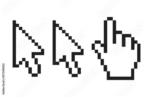 Set of pixelated computer mouse cursor icons. Pointer, arrow, and hand symbols in retro 8-bit style. Web click and select signs for UI/UX design. Vector graphic element.