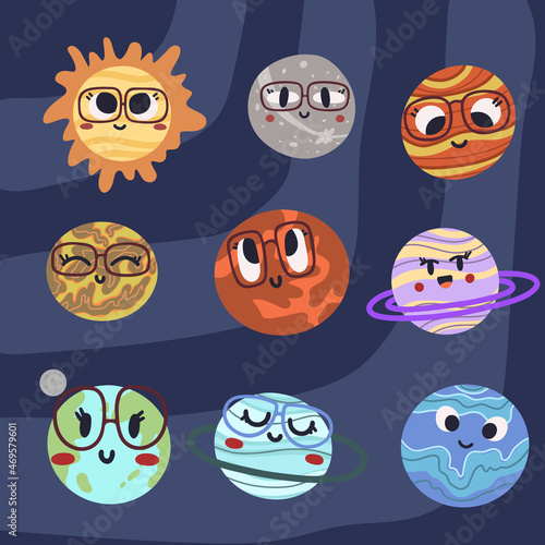 Set of planets of the solar system with faces in hand draw style. Vector illustration for posters, prints and cards