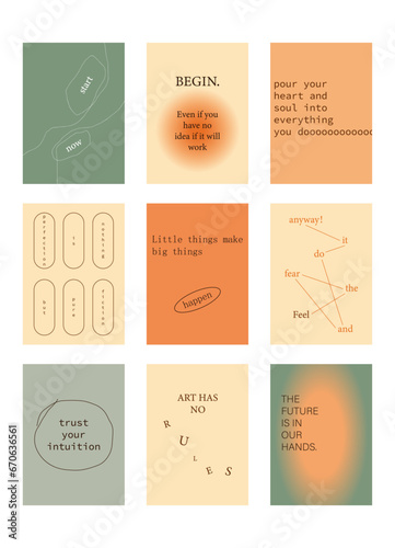 Set of positive social media quotes, motivation posters on trendy abstract background in neutral colors.