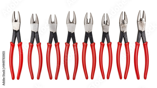 Set of professional cutting pliers with various styles and bright red handles isolated on white transparent background