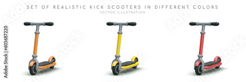 Set of realistic 3d kick scooter in red, orange and yellow colors. Rent and vehicle sale concept. Ecological transport, healthy lifestyle concept. Colorful vector illustration