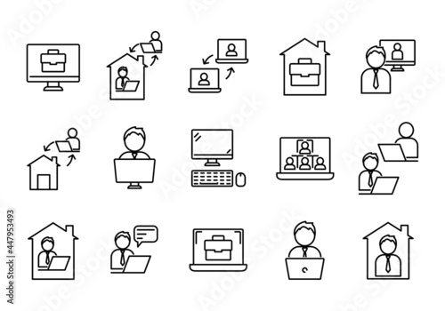 Set of remote work concept icons. Flat working pictograms for web. Line stroke. Isolated on white background. Outline vector eps10. Online communication with office staff