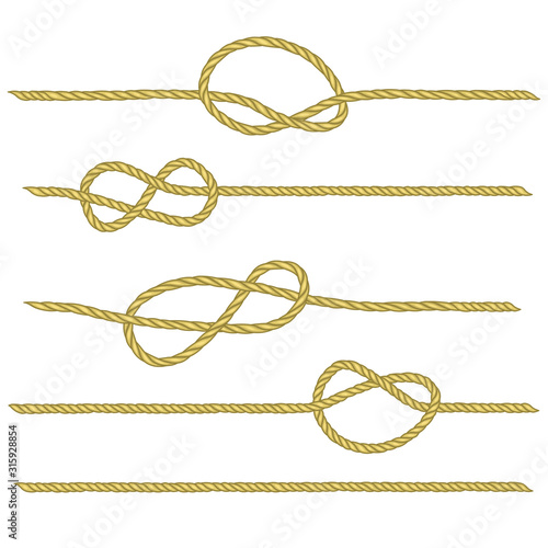 Set of ropes with different nodes. Drawing related to maritime. Sailor rope tying the nautical knot. Vector brush.