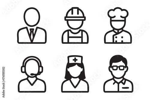 Set of six black outline icons depicting various professions, including business, construction, culinary, customer service, healthcare, and technology.