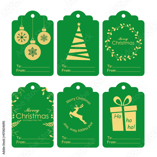 Set of six Christmas tags. Christmas elements on green background and space for text