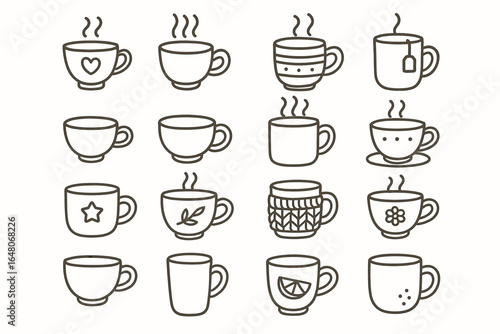 Set of sixteen minimalist coffee and tea mug line art illustrations