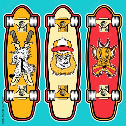 set of skateboards wolf, monkey and demon drawing