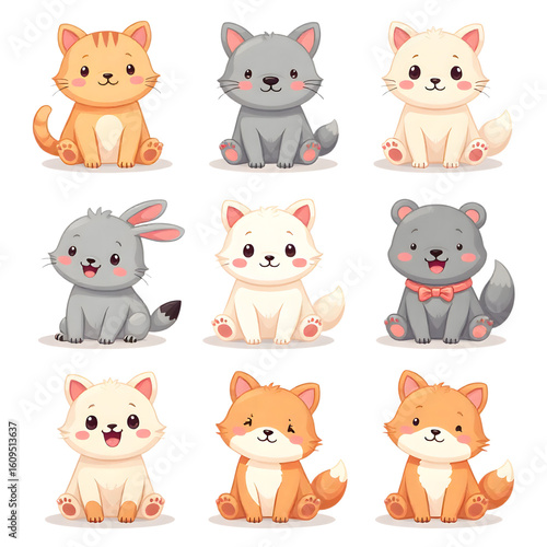 Set of sweet and playful cartoon cats, rabbits, and bears, perfect for kids.