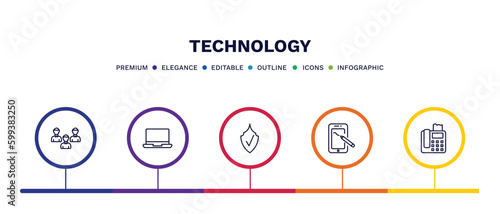 set of technology thin line icons. technology outline icons with infographic template. linear icons such as customers, laptop frontal monitor, safe shield protection, drawing tablet, telephone with