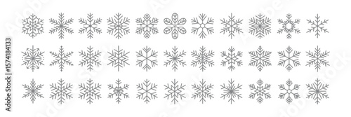 Set of Thirty Snowflake Line Art Designs with Geometric Style on White Background