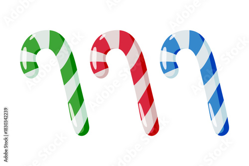 Set of three candy canes with glossy finish green-white, red-white, and blue-white diagonal stripes. Festive and colorful holiday illustration on white background. Perfect for Christmas-themed decor