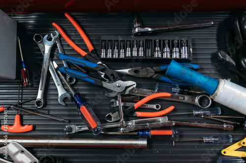set of tools on black background. working table. mechanic industry flat lay concept top view