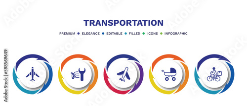 set of transportation filled icons. transportation filled icons with infographic template. flat icons such as airplane pointing up, car repair, air transport, pram, delivery bike vector.