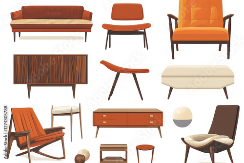 Set of trendy sofas, armchairs, with cushions in retro mid-century style. Modern soft furniture collection