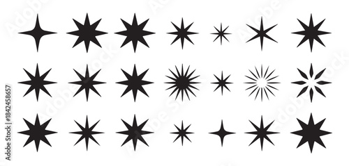 Set of twenty-four diverse black sparkle icons isolated on white background, star burst flashes, vector illustration