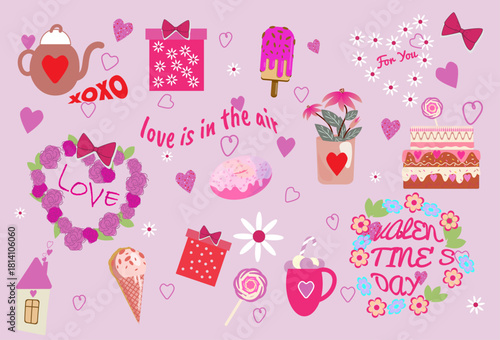 Set of Valentine's Day elements. Hearts, flowers, ice cream, cake, sweets, frames, words of love for card.