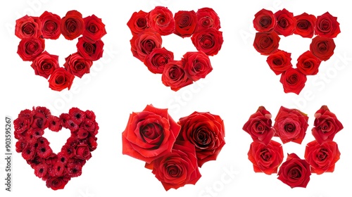 Set of Valentines Day Heart shape made of red roses decorations elements, isolated on white background