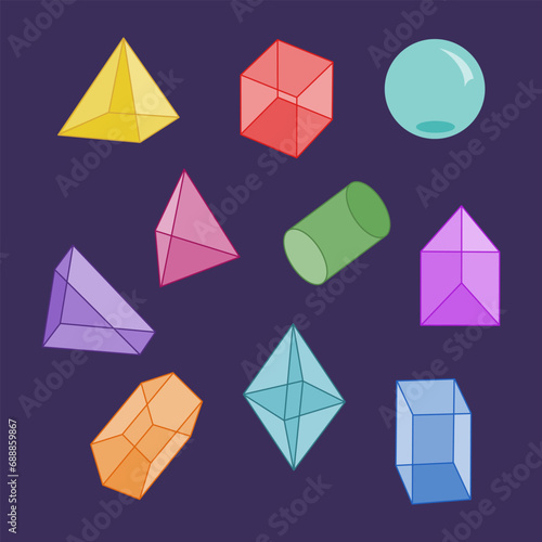 Set of various geometric shapes. Isometric view. Hand drawn vector illustration isolated on purple background. Modern flat cartoon style