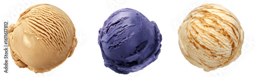 Set of various Ice cream scoops of different colors and flavors isolated on transparent background