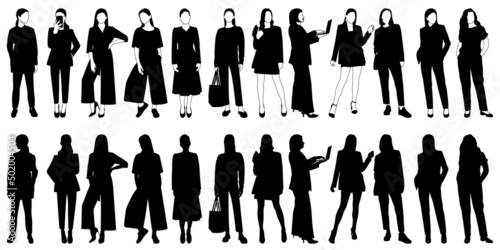 Set of vector silhouette of a slender girl, a woman in a fashionable suit standing. Adult model.