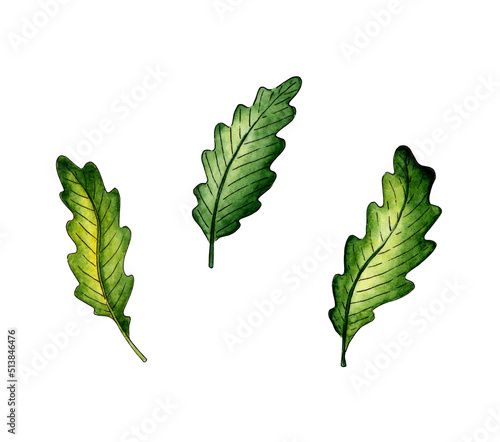 Set of watercolor illustrations of green oak leaves from a tree. Agriculture, eco friendly, organic farm. For the design of design compositions on the theme of tourism, hiking, outdoor recreation.