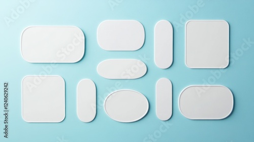 Set of white rectangular and oval badges, blank templates for branding, pastel cyan background