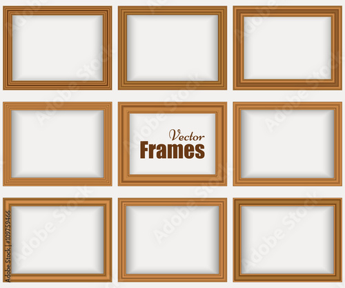 Set of wooden realistic frames with shadow isolated on the white wall. Vector illustration