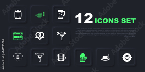 Set Oktoberfest hat, Bottle opener, Pretzel, Wooden beer mug, Street signboard with Beer, Sausage on the fork, Trumpet and barrel rack icon. Vector