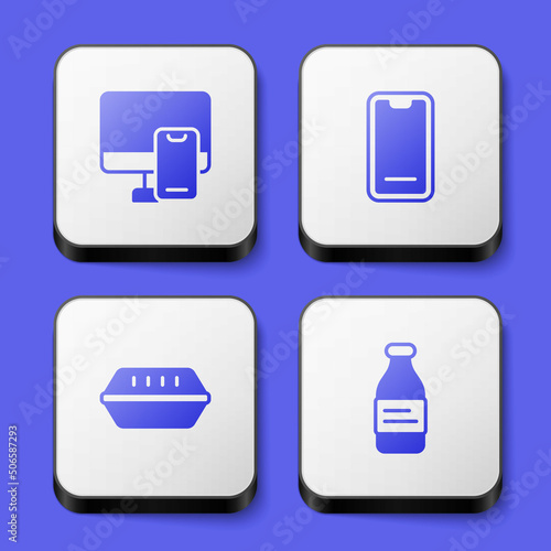 Set Online ordering food, Food on mobile, Lunch box and Bottle of water icon. White square button. Vector