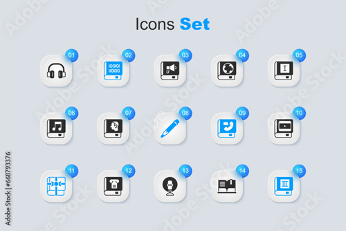 Set Open book, Law, Books about programming, as gift, cinema, Headphones and Pencil with eraser icon. Vector