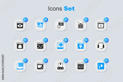 Set Page with a 404 error, Market analysis, Board graph chart, Advertising, Megaphone, Headphones, Personal information collection and Financial book icon. Vector