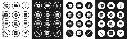 Set Paper clip, Printer, Blank notebook and pencil with eraser, Coffee cup flat, Drawer documents, Document folder, Laptop and cross mark on screen icon. Vector