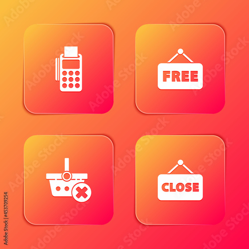 Set POS terminal with credit card, Price tag text Free, Remove shopping basket and Hanging sign Closed icon. Vector