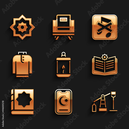 Set Ramadan Kareem lantern, Star and crescent, Oil pump or pump jack, Holy book of Koran, Shirt kurta, Speaker mute and Octagonal star icon. Vector