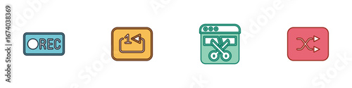 Set Record button, Repeat track music player, Video recorder editor and Arrow shuffle icon. Vector