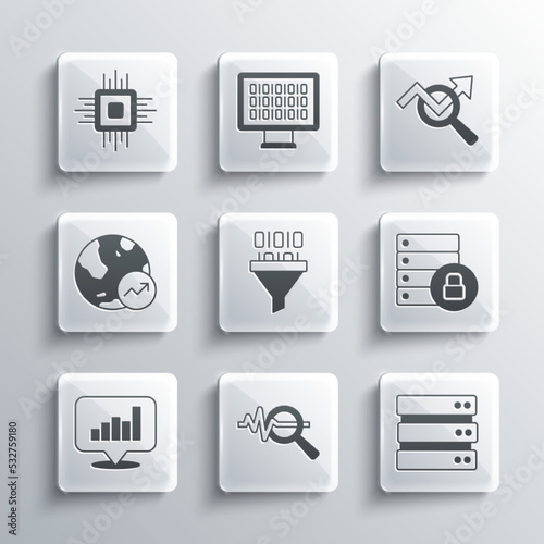 Set Search data analysis, Server, security with padlock, Binary code, Pie chart infographic, Financial growth, Processor CPU and icon. Vector