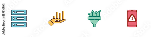 Set Server, Data, Web Hosting, Pie chart infographic, Sales funnel with and Mobile exclamation mark icon. Vector