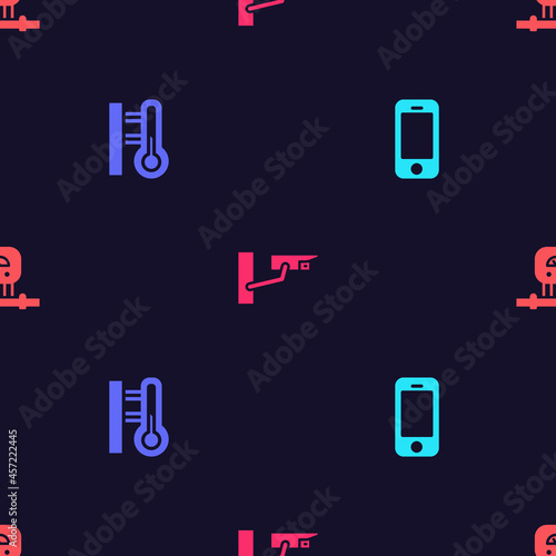 Set Smartphone, Meteorology thermometer, Security camera and sensor on seamless pattern. Vector