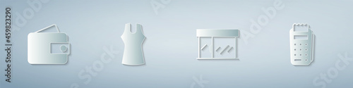 Set Wallet, Woman dress, Market store and POS terminal. Paper art style. Vector