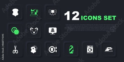 Set Washer, Electric iron, Teddy bear plush toy, Sewing thread spool, button for clothes, Leather, machine and icon. Vector
