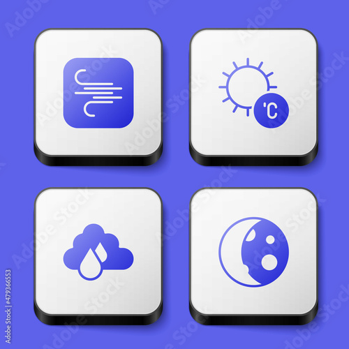 Set Wind, Sun, Cloud with rain and Moon phases icon. White square button. Vector