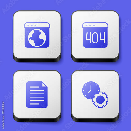 Set Worldwide, Page with a 404 error, File document and Time management icon. White square button. Vector