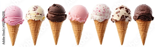 Seven Ice Cream Cones with Various Flavors and Toppings